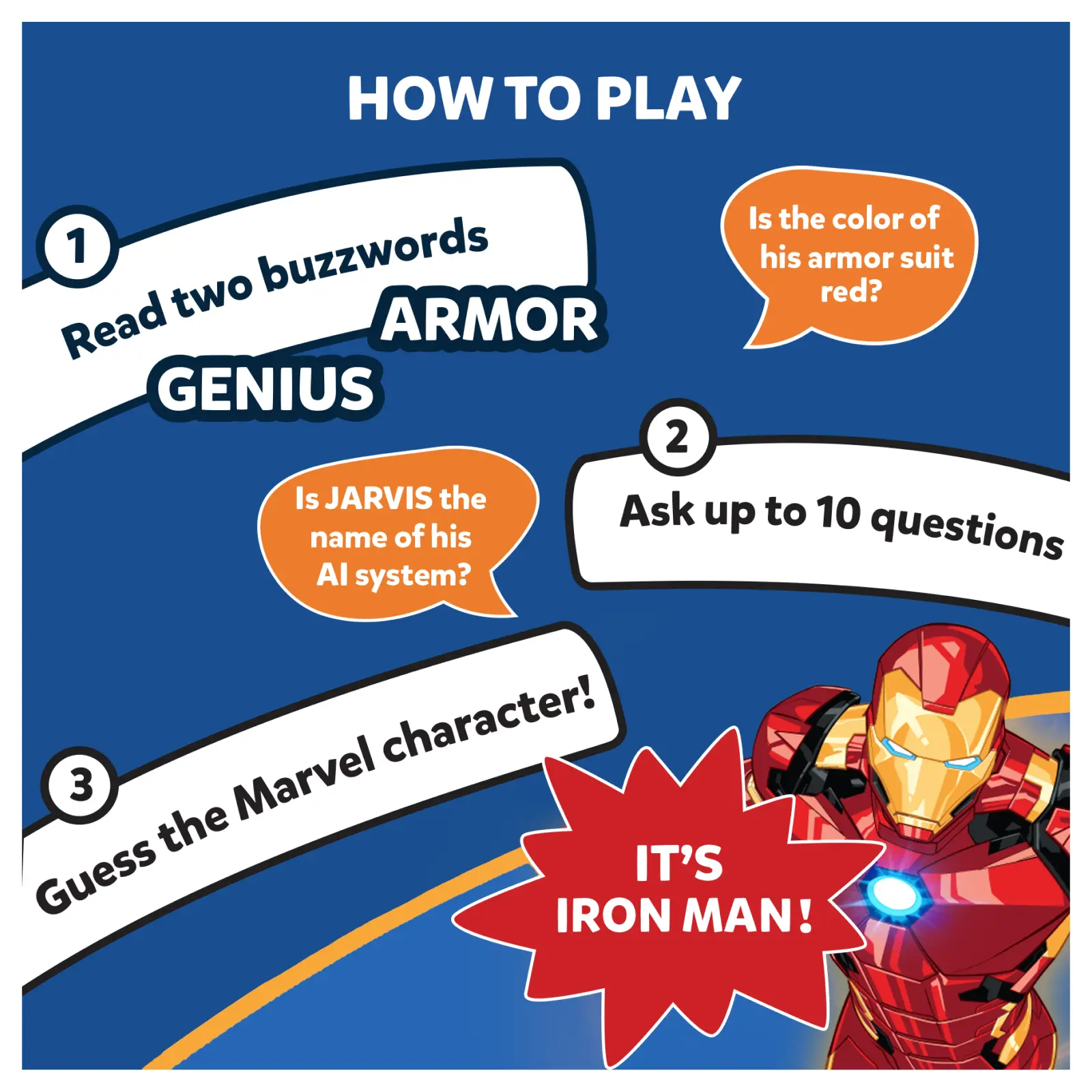 Bring home the most exciting game of questions! Ask up to 10 questions to guess the Marvel character on the Game Card! Can she fly? Is he a part of the Avengers? Is he from Wakanda? Think hard, ask intelligent questions, use your clue cards wisely, and be the first player to win 7 Game Cards!