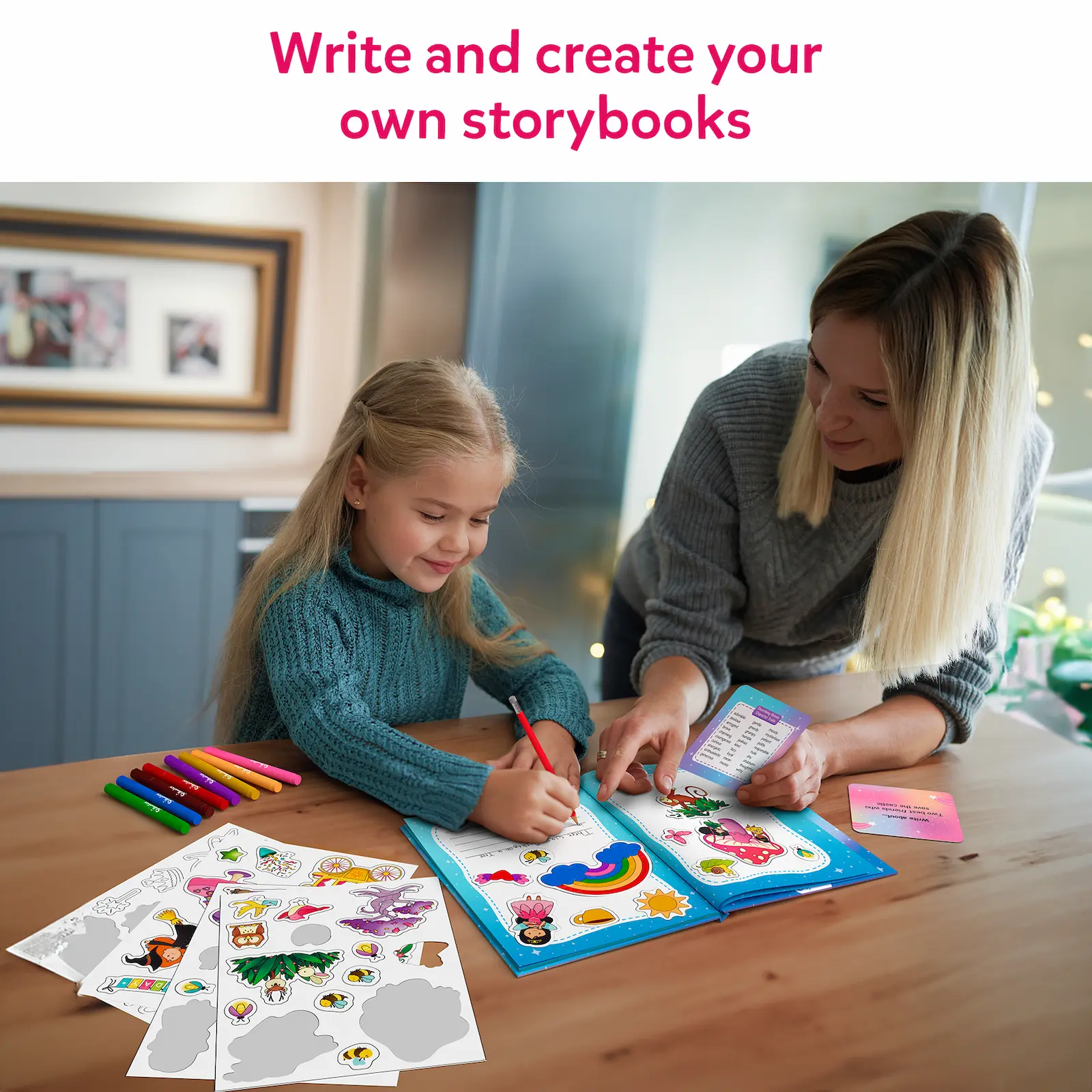 Step into the enchanting world of unicorns and princesses with Skillmatics' Storybook Art Kit! Our kit includes everything your child needs to become an author – writing prompts, vocabulary lists, colorful stickers, markers, and hardbound books for their stories!